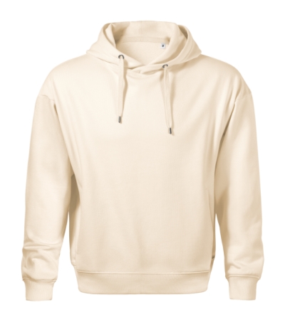 bez etikety – připraveno na rebranding, volný střih s bočními švy, kapuce s podšívkou, na stažení šňůrkou, neutrální velikostní štítek v boční části průkrčníku, vnitřní část průkrčníku začištěna páskou v barvě vrchového materiálu, nízkohlavicové rukávy, lištové kapsy ve stylu klokanky, dolní lem a manžety rukávů z žebrového úpletu 2:2 s 5 % elastanu, vnitřní strana počesaná
